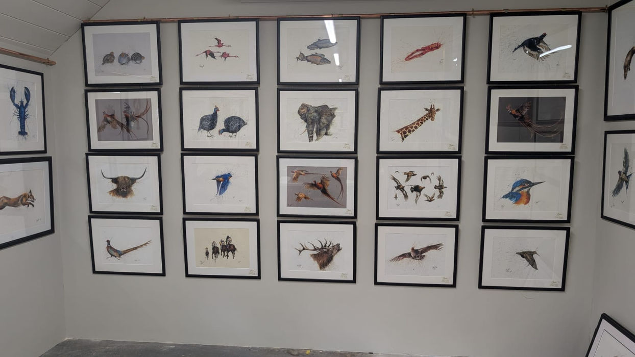 Some of Clare’s more recent collaborations have included creating colourful, bespoke magnums for Pol Roger Champagne. A painting day at Purdey & Sons in London which included the challenge of painting on beautiful pieces of walnut that are used to create the stocks on Purdey guns. Producing a vibrant and colourful rainbow trout to be used on the product packaging for Chalkstream Foods and then there was the creation of the stunning silk scarf for Really Wild that used Clare’s iconic fighting cock pheasants. Clare has also worked with Edinburgh Zoological Society and Bowland Brewery.